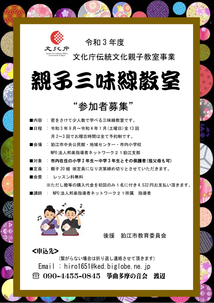 “令和3年度文化庁伝統文化親子三味線教室が始まります“